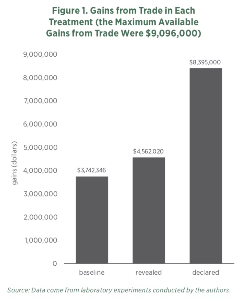We also measured the gains from trade between the buyer and seller. In each treatment, a total of about $9.1 million in experimental currency could have been earned.