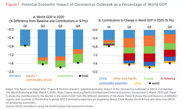 On March 2, 2020, the Organisation for Economic Co-operation and Development (OECD) estimated that a domino-like progress of COVID-19 into the developed world from China would generate a dramatic adverse impact on the global economy (see figure 1).