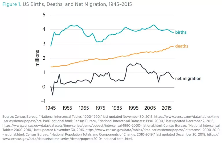 Three factors determine the change in any nation’s population over a given time: births, deaths, and net international migration. Behind the sharp decline in the US population growth rate in the past two decades has been a steady rise in deaths per year, a falling number of births owing to an even steeper decline in the birth rate, and declining levels of net international migration, a trend even more pronounced recently in large part because of executive actions by the Trump administration.