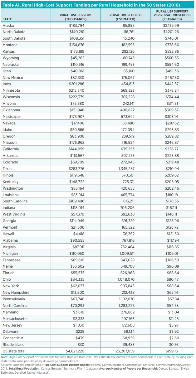 For instance, Alaska received over $2,100 in High-Cost Support funding per rural household in 2018. By contrast, Rhode Island received $0.76 per rural household in 2018. This disparity exists despite the fact that increasing the total amount of subsidy support per household has little effect on overall penetration rates.