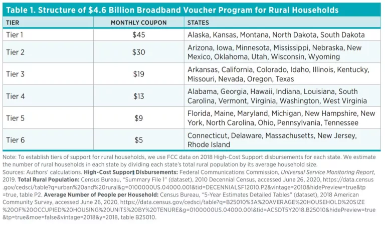 A $5 monthly coupon may not seem like much for rural residents of the lowest-tier states (mostly small states in the Northeast), but the $39 million those states receive under our plan (again, if uptake equals 100 percent) represents a big increase over the current subsidy level to those states, which was about $4 million in 2018. The FCC’s Connect America Cost Model assumes average revenue per user of $75 monthly, which means that our most generous voucher—$45 monthly—reduces rural households’ expected out-of-pocket expense to $30 monthly.