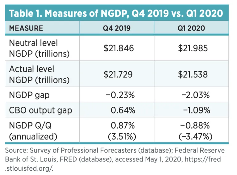 The neutral level of NGDP was $21.985 trillion in the first quarter of 2020 (see figures above). Actual NGDP came in at $21.538 trillion. NGDP, in other words, was 2.03 percent less than the public expected it to be. By way of comparison, the Congressional Budget Office (CBO) output gap reveals that the real economy was 1.09 percent smaller than its true potential over the same period. Relative to the previous quarter, actual NGDP declined by −0.88 percent (−3.47 percent on annualized basis). The NGDP gap experienced a larger decline than actual NGDP this quarter because the former shows the percent deviation of NGDP from where it was expected to be, whereas the latter shows the percent deviation of NGDP from its value in the previous quarter.
