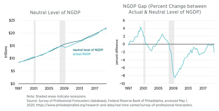 The rationale for this understanding is twofold. First, members of the public make many economic decisions, such as whether to take out a mortgage or a car loan, on the basis of forecasts of their nominal income. Similarly, firms may finance with debt and commit to multiyear contracts on plants, raw materials, and labor on the basis of forecasts of their nominal income. Second, the actual realization of nominal incomes may turn out to be very different from what is expected and, as a result, may be disruptive for households and firms that are not be able to quickly adjust their economic plans. These disruptions can be avoided by maintaining total nominal income or NGDP on the growth path expected by the public. In other words, the Fed should aim to close the NGDP gap in order to keep monetary conditions neutral.
