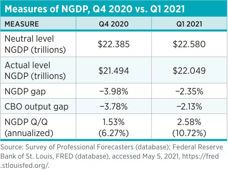 By way of comparison, the Congressional Budget Office (CBO) output gap reveals that the real economy was 2.13 percent smaller than its true potential in the first quarter in 2021 (see table). Also, relative to the previous quarter, actual NGDP grew by 2.58 percent (10.72 percent on an annualized basis) over the same period. NGDP growth in the first quarter of 2021 was up compared to the previous quarter but still needs additional gains to close the negative NGDP gap.