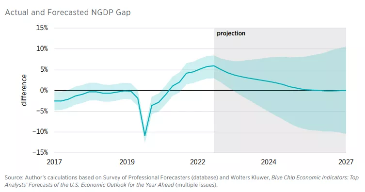 A forecast of the NGDP gap shows that it will stay positive but shrink rapidly in 2023. This forecast, however, has wide prediction intervals, which means it is surrounded by a lot of uncertainty. Also, the projected NGDP gap is conditional on NGDP forecasts from early January that will likely be lowered as the effects of the Fed’s interest rate hikes continue to slow the economy.