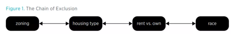 The chain of exclusion offers a clear framework for understanding the likely effects of zoning in other cities. Data on racial homeownership patterns and housing type ownership and rent splits are readily available and can guide local discussions of zoning as a barrier to integration.