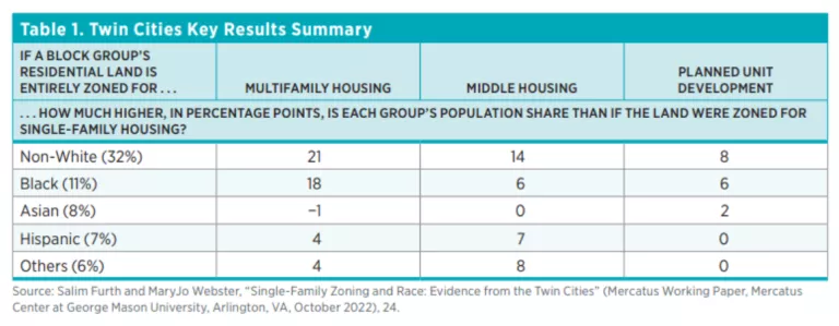 - In the Twin Cities metro area, zoning for multifamily housing is associated with a 21 percentage point higher non-White population share, enough to double the non-White population share of an average neighborhood zoned exclusively for single-family residences.