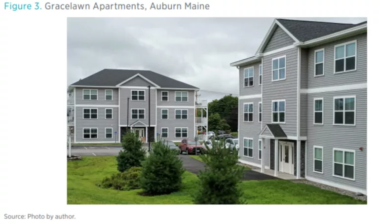 To achieve a complete, block-level integration of housing types, cities must allow a range of economically viable structures throughout their residential districts. When Auburn, Maine, wanted to encourage citywide housing abundance and integration, it modeled its new regulations on a recent mid-rise apartment complex, shown in figure 3. Grounding the regulations in market reality guaranteed that the hard political work of rezoning would immediately pay dividends.