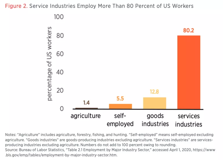 Service-producing industries account for a large majority of US economic activity and employment, as shown in figures 1 and 2. These industries account for 80 percent of value added in US GDP (the latest data available are from Q3 2019); for 65 percent of value added in world GDP (the latest data available are from 2018); and for 80.2 percent of US employment (the latest data available are from 2018). For many sectors that provide services, exports are a main source of revenue. But when service-providing businesses export, those trade flows are often invisible in traditional data.