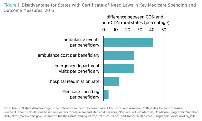 These states have varying socioeconomic characteristics that are associated with poor health outcomes. Still, when the researchers control for age, race, poverty status, and education, rural states with CON laws fare worse both in terms of health outcomes and healthcare spending than their non-CON counterparts (see figure 1).
