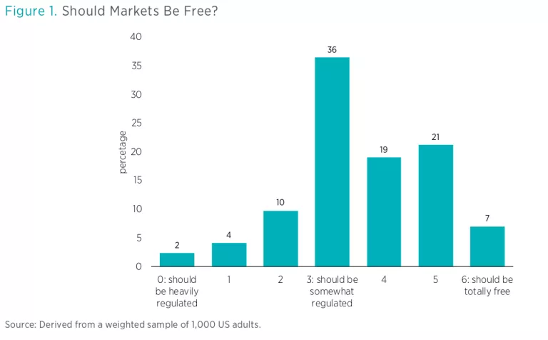 When a free market was expressed as an abstract idea, respondents were generally supportive. Consider figure 1, which shows responses to the question “Should markets be free?” Possible responses ranged from 0, indicating a belief that markets “should be heavily regulated” to 6, indicating a belief that markets “should be totally free.”