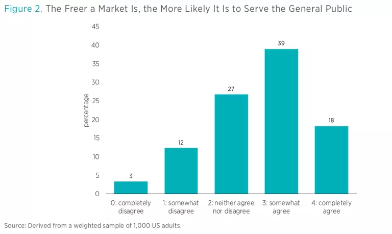 This support for freer markets is backed by a perception that markets tend to serve the general public. Figure 2 shows the range of responses to the statement “The freer a market is, the more likely it is to serve the general public.” Possible answers ranged from 0, “completely disagree,” to 4, “completely agree.” As with the previous question, answers skewed toward the right, indicating general support for the statement.
