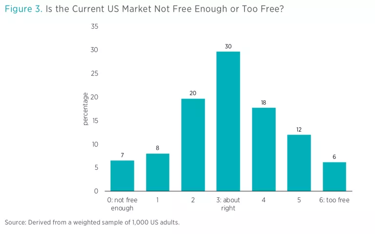 Support for the abstract notion of a free market weakened, however, once the questions became a little more specific. Consider figure 3. It shows responses to the question “Is the US market too free?” Possible answers ranged from 0, indicating that respondents thought the US market is “not free enough,” to 6, indicating a belief that US markets are “too free.”