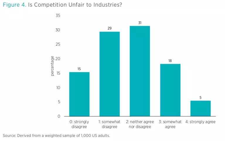 One important attribute of a healthy market economy is competition (especially when competition is interpreted as the absence of government-created monopoly). Figure 4 presents responses to the question “Is competition unfair to industries?” Possible answers ranged from 0, “strongly disagree,” to 4, “strongly agree.” The modal response was 2, “neither agree nor disagree,” and answers were skewed leftward, indicating general disagreement with the statement (i.e., a general belief that competition is fair). Just one-fourth of respondents said they either somewhat or strongly agree that competition is unfair to industries. This, therefore, is further support for generally open markets.