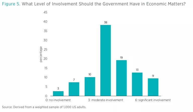 Figure 5 shows responses to the question “What level of involvement should the government have in economic matters?” Possible answers ranged from 0, “no involvement,” to 6, “significant involvement.” The modal response, selected by about 4 in 10 respondents, was 3, “moderate involvement.” Answers, however, were skewed toward favoring more involvement: 41 percent responded with a 4, 5, or 6, while only 20 percent responded with a 0, 1, or 2.