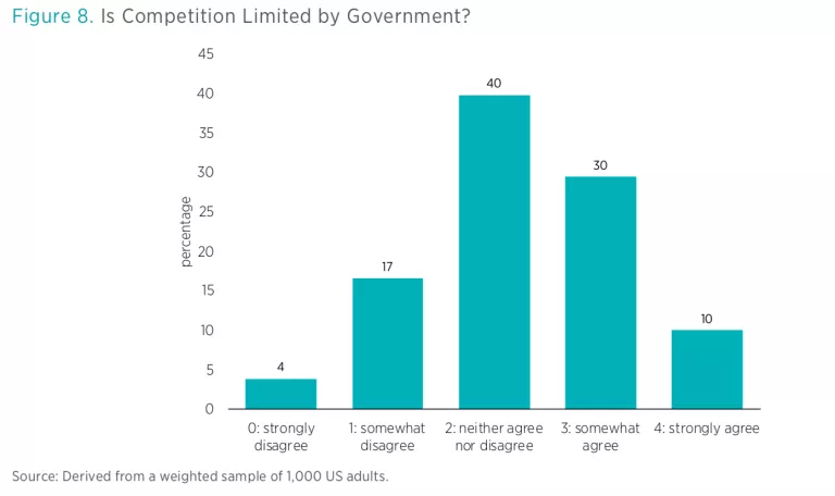 In an attempt to probe perceptions of regulatory capture, the survey asked respondents, “Is competition limited by government?” Figure 8 presents the results. The modal response was 2, “neither agree nor disagree,” but responses did skew toward agreement, with 40 percent either somewhat or strongly agreeing and only 20 percent somewhat or strongly disagreeing (these responses are particularly interesting in light of the fact that respondents tended to think that regulations benefit consumers).
