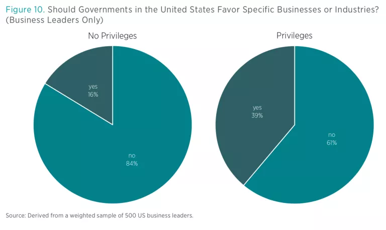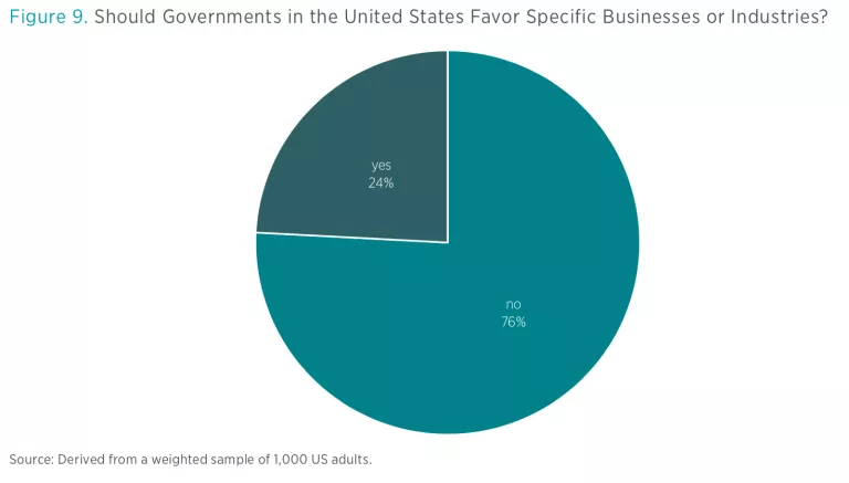 Our final set of questions probed perceptions of favoritism. The first was straightforward: “Should governments in the United States favor specific businesses or industries?” As shown in figure 9, the overwhelming majority of respondents, 76 percent, replied “no,” while only 24 percent approved of favoritism.