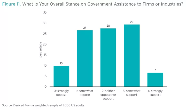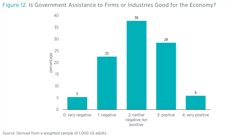 When questions are couched in these more neutral terms, the public appears to be more supportive of government assistance to firms or industries. Only 37 percent said that they either somewhat or strongly oppose government assistance to firms or industries. The three midrange options, “somewhat oppose,” “neither oppose nor support,” and “somewhat support,” each garnered about the same amount of support. And taken together, 84 percent of respondents selected one of these three options.