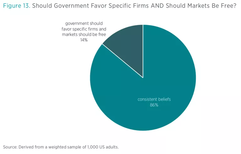 The good news is that most people hold consistent beliefs. Only 14 percent of respondents thought government should favor particular firms or industries and also thought that markets should generally be free.