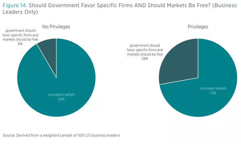 It is interesting to compare the general public’s views here with those of the business leaders discussed in the study. Figure 14 shows business leader beliefs, broken down by whether or not the leader believes he or she works at a favored firm. Among business leaders whose firms benefit from government privilege, 28 percent support favoritism and also support a free market. Among those whose firms do not benefit from privilege, just 8 percent support favoritism and also support a free market.