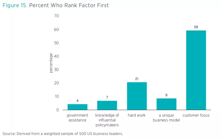 Figure 15 shows the share of business leaders who selected each factor as the most important. Fifty-nine percent of respondents selected customer focus as the most important factor in business success. The other socially beneficial strategy, a unique business model, was selected by 9 percent of leaders as the most important factor. Just 11 percent of respondents selected the two socially destructive strategies, while 21 percent selected hard work as the most important factor.