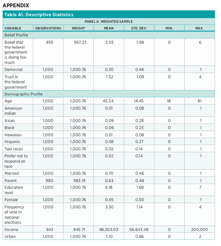 To qualify for the study, respondents had to be 18 years of age or older and had to currently reside in the United States. The subset of respondents who were identified as business leaders had to be employed full time, be manager level or above, know the size of their firms, know their firm’s financials, and either be decision makers or have influence over the firm’s financial decisions. The survey was conducted online, included 61 questions, and took participants 10 to 15 minutes to complete. Participants were offered a nominal incentive to participate ($27 for business leaders and $4 for the non-business-leader population). The business leader sample included respondents from each of the 20 broad industry categories identified in the North American Industry Classification System. For more details on the survey and the sample, please refer to the study itself or to summaries of it published on The Bridge and in Reason.