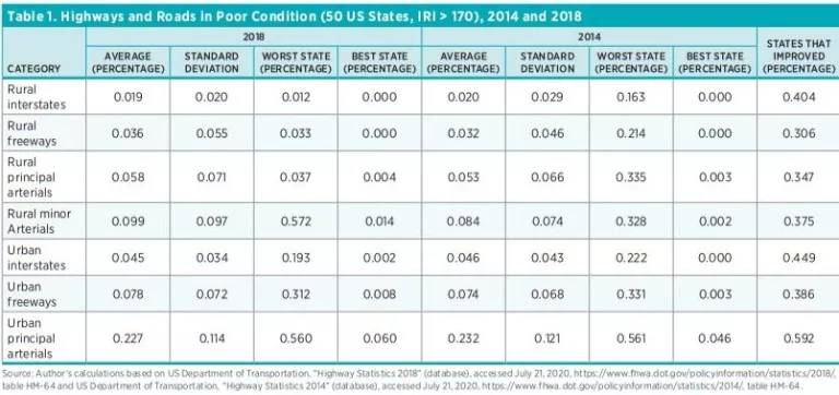 This policy brief uses US Department of Transportation (DOT) state-level highway, road, and bridge data to evaluate current conditions in surface transportation infrastructure. The brief updates a Mercatus on Policy report published in 2017. At that time, the percentage of poor-quality highways and roads had not changed much between 2005 and 2014. There were fewer bridges in poor shape in 2014 than in 2005. However, there was considerable variation in highway, road, and bridge conditions across states. This update for the period from 2014 to 2018 (2014 to 2019 for bridges) draws similar conclusions.