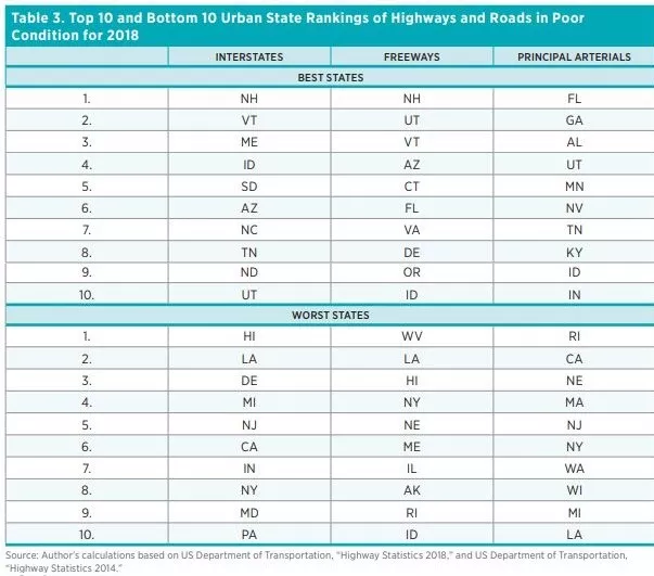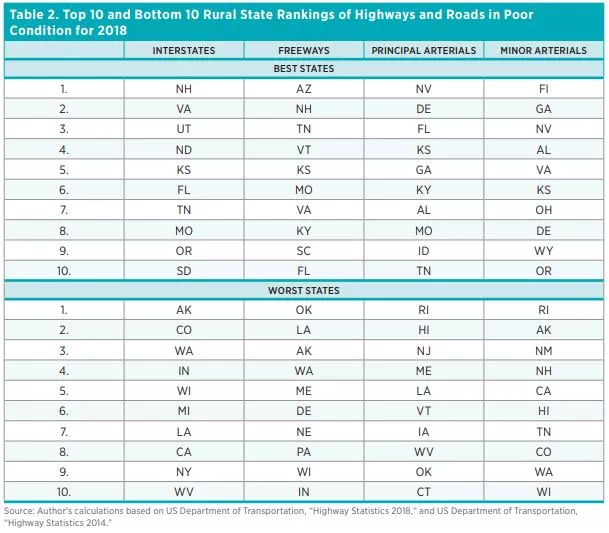 Tables 2 and 3 show the top 10 and bottom 10 state performances with respect to highway and road conditions in 2018.