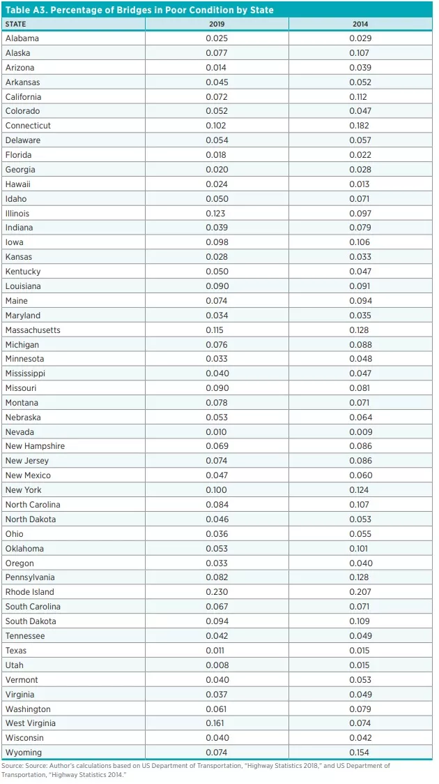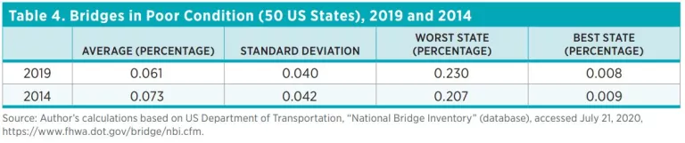 The percentage of bridges in poor condition has declined between 2014 and 2019. Eighty-two percent of the states experienced some improvement over this time period. It appears that states have made a concerted effort to improve bridges since 2005.