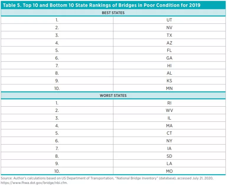 For each state, the percentage of bridges in poor condition is calculated by dividing the square meters of bridge span rated in poor condition by the total square meters of bridges in the state. The results are reported in table 4. The average percentage of bridges in poor condition declined from 7.3 percent in 2014 to 6.1 percent in 2019. The dispersion of bridges in poor condition declined slightly from 4.2 percent in 2014 to 4 percent in 2019, suggesting that there is slightly less diversity in bridge condition across the states. This improvement continues the trend that occurred between 2005 and 2014. All state-by-state bridge conditions are shown in table A3 for 2014 and 2019. Eighty-two percent of the states experienced a decline in square meters of bridge surface classified as being in poor condition between 2014 and 2019. Table 5 shows the top 10 and bottom 10 state rankings of bridges in poor condition in 2019.