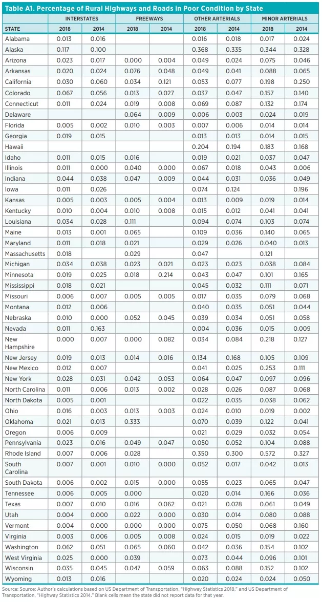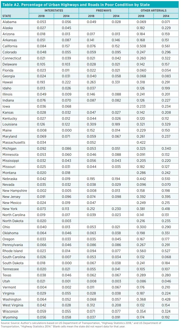 The dispersion in road conditions across states, as measured by the standard deviation, is like that seen in the 2005–2014 data. For the recent period, there was a narrowing of the dispersion in interstate highway conditions across states in both rural and urban areas, suggesting that poor-quality stretches of roads were improved. This result, along with the decline in the percentage of interstate highways in poor condition, indicates a modest improvement in the quality of the Interstate Highway System between 2014 and 2018. All state-by-state performances are shown in the appendix (tables A1 and A2).