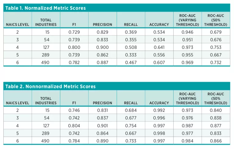 In both models, we employed a Term Frequency–Inverse Document Frequency preprocessor to normalize document length and, in the case of the logit model, to normalize coefficients for the purposes of calculating the penalty. The models were tuned and compared using fivefold cross-validation using the average F1 score across all classes. For each level of NAICS, the logit model was the superior classifier. The smallest regularization parameter that was within one standard deviation of the top score was selected for training the model on the full training set for each level.