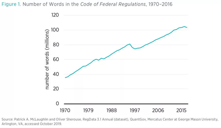 At the time of this writing, the Code of Federal Regulations (CFR)—the dense legal text containing the existing stock of federal regulations in the United States—stands at more than 100 million words. Reading the current CFR as a full-time job would take the average reader (reading at 300 words per minute) about three years and 107 days to read. The CFR was not always this large. In fact, the CFR is more than 2.5 times the size that it was in 1970, and the growth over the past 50 years has been relatively steady (with the exception of a few very brief reductions in size). Figure 1 shows this growth. The available evidence on state regulations (though it is limited) appears to tell a similar story of steady regulatory growth.