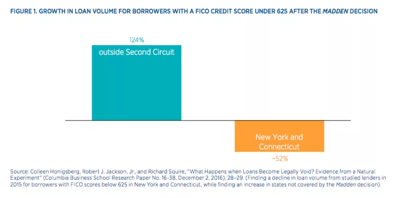 Although the Madden case did not involve fintech lenders, the risk that a bank loan purchased by a nonbank could become invalid has direct implications for the bank-partnership model. The case has produced considerable fallout in the Second Circuit, including a significant reduction in credit for borrowers with lower credit scores (who would be charged a higher rate). Professors Colleen Honigsberg, Robert J. Jackson, and Richard Squire have documented this decline. As shown in figure 1, they find that in 2015 in New York and Connecticut (states in the Second Circuit) the number of loans made by leading marketplace lending platforms to borrowers with FICO credit scores below 625 decreased by 52 percent relative to 2014, while in other circuits the number of loans for comparable borrowers increased by 124 percent. Conversely, loan growth for borrowers with FICO scores above 700 (who would be less likely to be charged interest in excess of New York’s or Connecticut’s usury limits) were comparable between New York and Connecticut and other circuits.