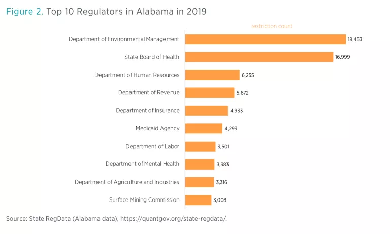 The regulations in the AAC are organized by the department, commission, or board overseeing particular rules. Figure 2 shows that the title of the AAC associated with the Department of Environmental Management contains 18,453 restrictions. By this measure, this is the biggest regulator in Alabama. Coming in second is the State Board of Health, with 16,999 restrictions.