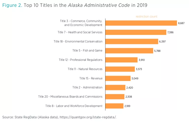 The titles in the AAC are organized by the type of regulation they contain. Figure 2 shows that title 3, associated with Commerce, Community, and Economic Development, includes 8,687 restrictions. By this measure, this is the biggest title in the AAC. Coming in second is title 7, Health and Social Services, with 7,386 restrictions.