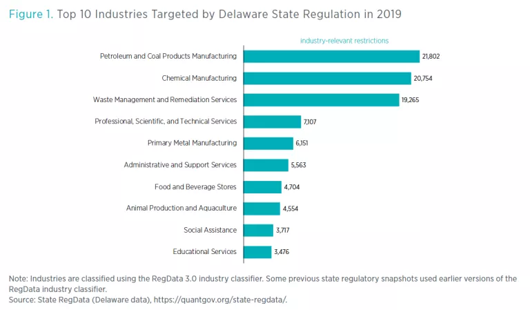 Researchers are only beginning to understand the consequences of the massive and growing federal regulatory system on economic growth and well-being in the United States.[6]Meanwhile, the effects of state regulation remain largely unknown. If this snapshot of Delaware regulation in 2019 is a good indicator, then the states are also active regulators, suggesting that the full impact of regulation on society is far greater than that of federal regulation alone.