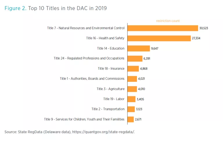The titles of the DAC are organized by the type of regulations they contain. Figure 2 shows that title 7 of the DAC, associated with natural resources and environmental control, contains 30,523 restrictions. By this measure, this is the biggest title in the DAC. Coming in second is title 16, related to health and safety, with 27,334 restrictions.