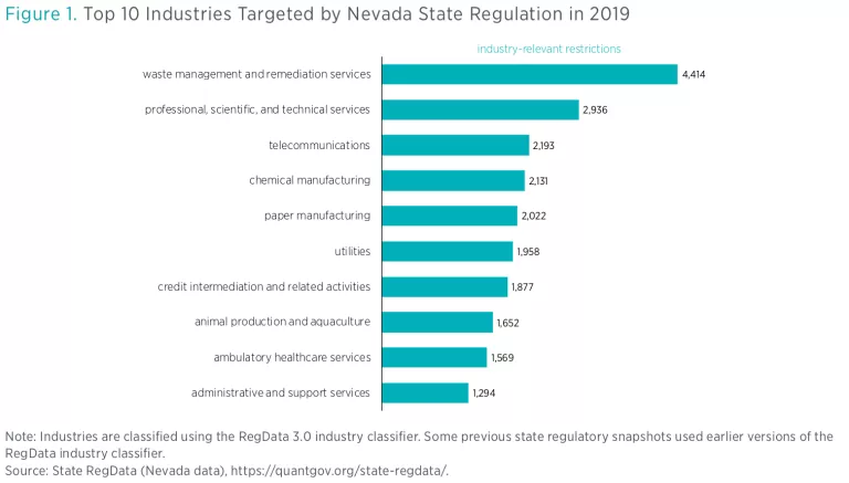 Researchers at the Mercatus Center at George Mason University developed State RegData, a platform for analyzing and quantifying state regulatory text. State RegData captures information in minutes that would take hours, weeks, or even years to obtain by reading and counting. For example, the tool allows researchers to identify the industries that state regulation targets most by connecting text relevant to those industries with restrictive word counts. These regulatory restrictions are instances of the words and phrases shall, must, may not, prohibited, and required, and they can signify legal constraints and obligations. As shown in figure 1, the three industries with the highest estimates of industry-relevant restrictions in the 2019 NAC are waste management and remediation services; professional, scientific, and technical services (which includes legal services, accounting and tax preparation, and a variety of other professional services); and telecommunications.