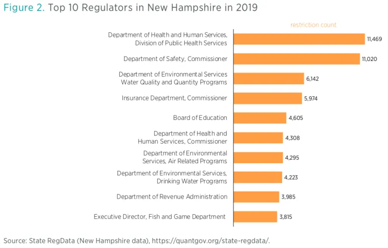 State RegData also reveals that the 2019 NHCAR contains 123,423 restrictions and 7.3 million words. It would take an individual about 403 hours—or more than 10 weeks—to read the entire NHCAR. That’s assuming the reader spends 40 hours per week reading and reads at a rate of 300 words per minute. By comparison, there are 1.09 million additional restrictions in the federal code. Individuals and businesses in New Hampshire must navigate these different layers of restrictions to remain in compliance.
