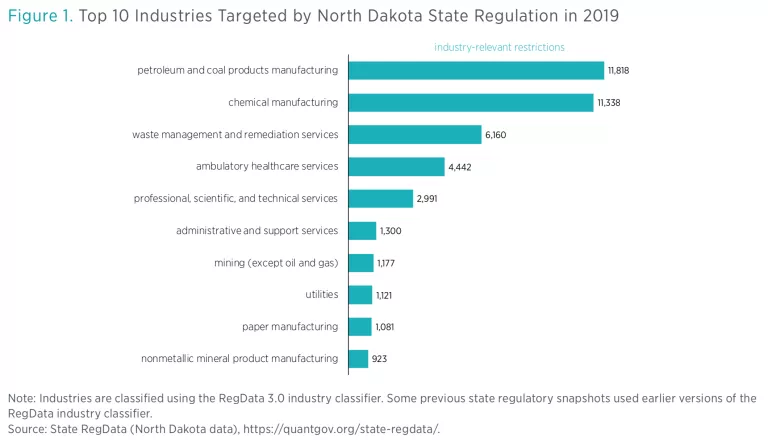 Researchers at the Mercatus Center at George Mason University developed State RegData, a platform for analyzing and quantifying state regulatory text. State RegData captures information in minutes that would take hours, weeks, or even years to obtain by reading and counting. For example, the tool allows researchers to identify the industries that state regulation targets most by connecting text relevant to those industries with restrictive word counts. These regulatory restrictions are instances of the words and phrases shall, must, may not, prohibited, and required, and they can signify legal constraints and obligations. As shown in figure 1, the three industries with the highest estimates of industry-relevant restrictions in the 2019 NDAC are petroleum and coal products manufacturing; chemical manufacturing; and waste management and remediation services.