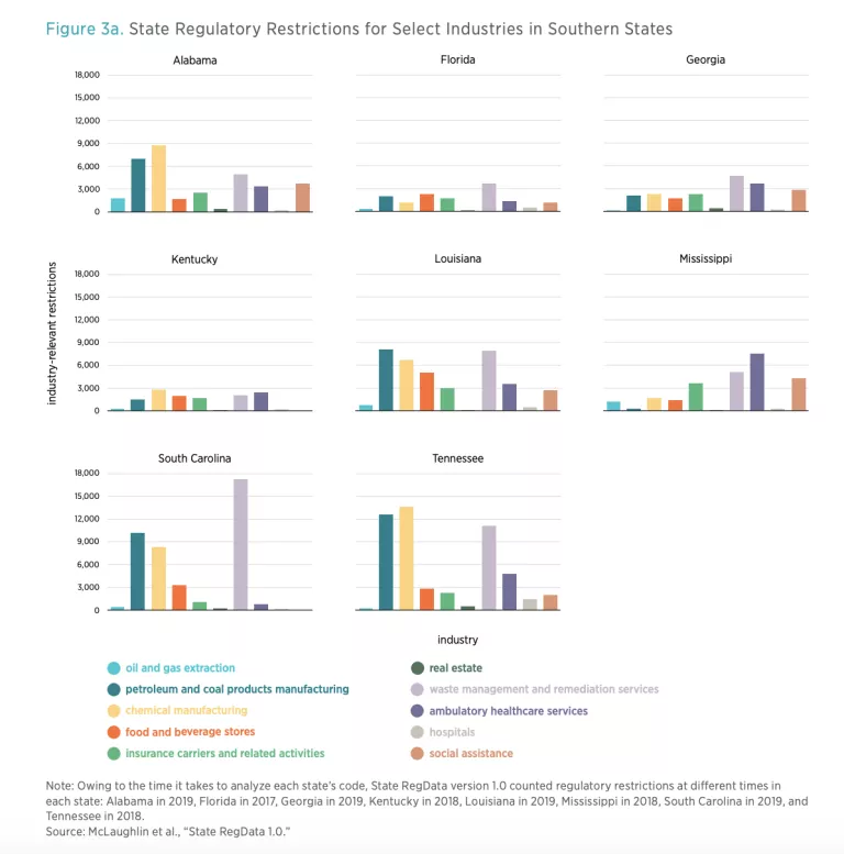 In 2019, the Mercatus Center launched State RegData, which extended the technology underlying RegData to state administrative codes. This allowed, for the first time, for aggregate levels of regulation across the various states to be compared to one another. This report takes a deeper dive into the data generated by the various RegData projects to better understand the regulatory landscape in the southern region of the United States. Specifically, this report summarizes data for eight states: Alabama, Florida, Georgia, Kentucky, Louisiana, Mississippi, South Carolina, and Tennessee. The report compares these states’ regulatory environments along a variety of dimensions, including overall word counts in state codes, restrictiveness of regulations in state administrative codes, restrictions across industries, federal regulation of the various states, and population-adjusted restrictions.