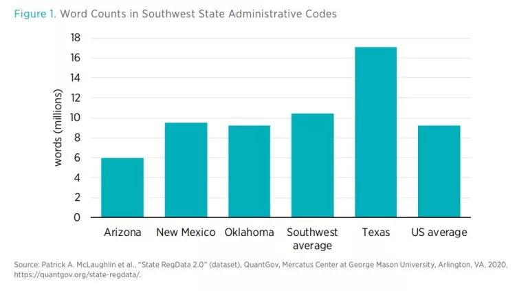 The simplest way to quantify how much state regulation exists is simply to count the words in states’ administrative codes (figure 1). For example, the Texas Administrative Code contains 17.1 million words, while Arizona’s administrative code contains just 6.0 million words. The Southwest average is 10.5 million words and the national average is 9.2 million.