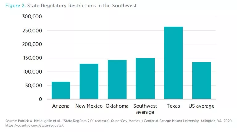If one instead counts the restrictive terms in administrative codes, then Texas remains the most regulated Southwest state, with 263,369 restrictions (figure 2). Arizona is the least regulated state in the region by this metric, with just 64,319 restrictions.