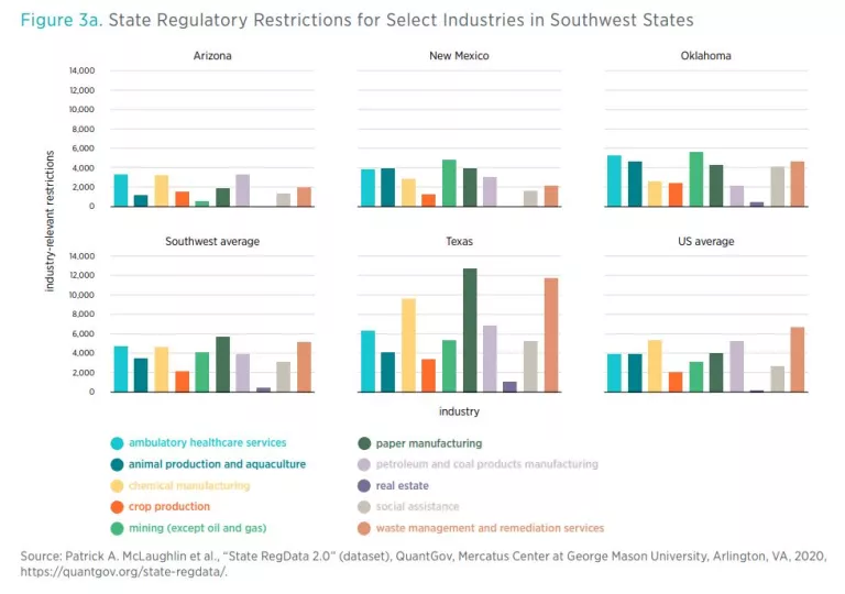 In 2019, the Mercatus Center launched State RegData, which extended the technology underlying RegData to state administrative codes. This allowed for aggregate levels of regulation across the various states to be compared to one another. This report takes a deeper dive into the data generated by the various RegData projects to better understand the regulatory landscape in the Southwest. Specifically, this report summarizes data for four states: Arizona, New Mexico, Oklahoma, and Texas. Using data from State RegData version 2.0, as well as other sources, the report compares these states’ regulatory environments along a variety of dimensions, including overall word counts in state administrative codes, restrictiveness of regulations in state administrative codes, restrictions across industries, federal regulation affecting the various states, and population-adjusted restrictions.
