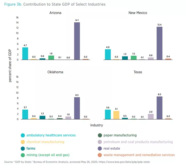The variation in the number of restrictions on various industries across this region could be explained by the relative importance of each sector to each state’s economy. Without assuming any direct causal relationship between the volume of regulations that falls on an industry and that industry’s contribution to GDP, in figure 3b we present the percentage of state GDP associated with each of these industries for the four states. Chemical manufacturing contributes a larger share to the Texas economy than to the other states, and it is more regulated too. Real estate is relatively important in all the states’ economies and is lightly regulated in all states too.