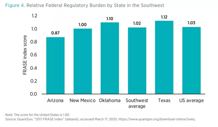 The Mercatus Center has also produced data to better understand the degree to which federal regulation targets states. By weighting estimates of industry-relevant federal restrictions according to how important various industries are to states’ gross state product, the Federal Regulation and State Enterprise (FRASE) index is able to rank the states in terms of how regulated they are by the federal government (figure 4). Texas receives a score of 1.12. This ranking is scaled relative to the nation as a whole, which receives a score of 1.00, so a score of 1.12 means that Texas industries are targeted by federal regulation 112 percent as much as industries across the nation as a whole are. On average, the states in the Southwest are, by this measure, about as regulated as the nation as a whole.
