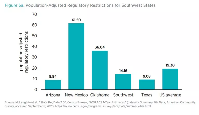 For these reasons, it could make sense to adjust for population when reporting regulatory restrictions. Figure 5a shows that New Mexico is the most regulated state in the Southwest, adjusting for population, with 61.50 restrictions per 1,000 people. By this measure, Arizona remains the least regulated state in the Southwest, with just 8.84 restrictions per 1,000 people. On average, the Southwest is less regulated on a per-capita basis than the United States is as a whole.