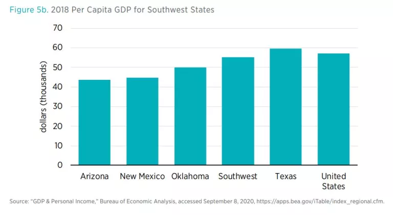 Figure 5b shows the GDP per capita for each of the states. Again, we stress that we are not attempting to establish a causal relationship between regulation and GDP, but merely putting the volume of regulatory restrictions in the context of the local economies.