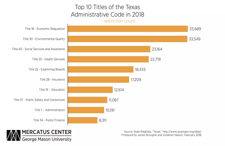 Researchers are only beginning to understand the consequences of the massive and growing federal regulatory system on economic growth and well-being in the United States. Meanwhile, the effects of state regulation remain largely unknown. If this snapshot of Texas regulation in 2018 is a good indicator, then the states are also active regulators, suggesting that the full impact of regulation on society is far greater than that of federal regulation alone.